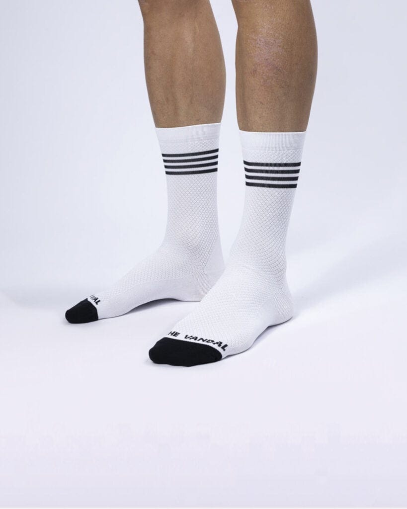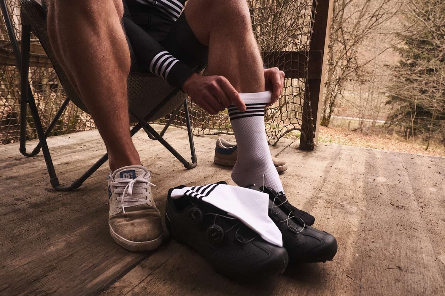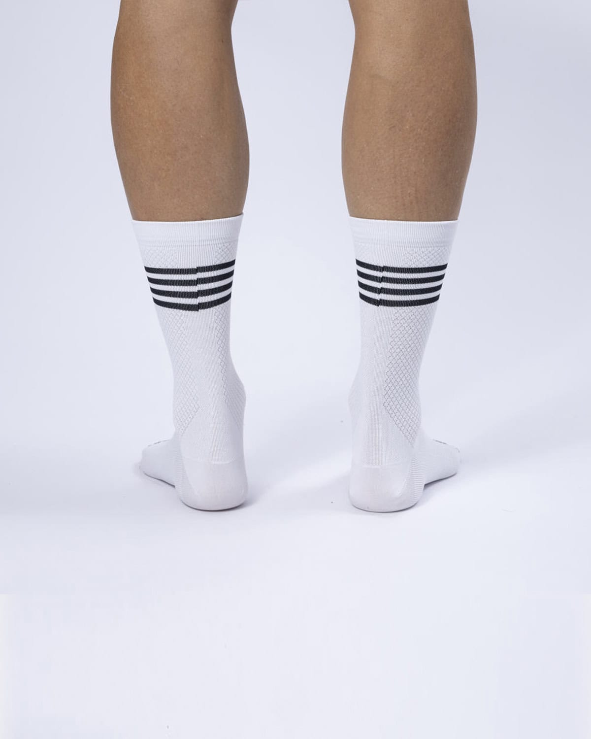 Our WHTE. Cycling Socks. Marginal gains. For the cyclist, every detail is important. Definitely the socks. The right height, matching color with your kit, they complete your look while providing the necessary comfort. With our cycling socks you have this perfect mix. With a height of 20 cm, the sweat-wicking properties and supportive stretch of our socks, you are ready to rock. These WHTE. Socks are the perfect match with our BLCK. Jersey.