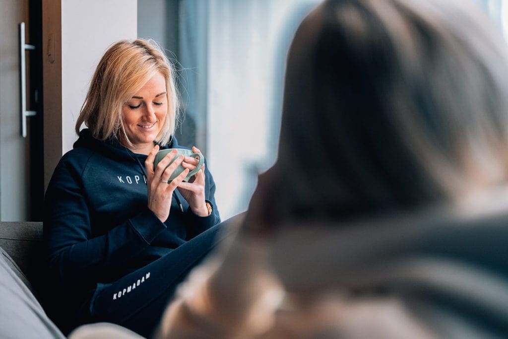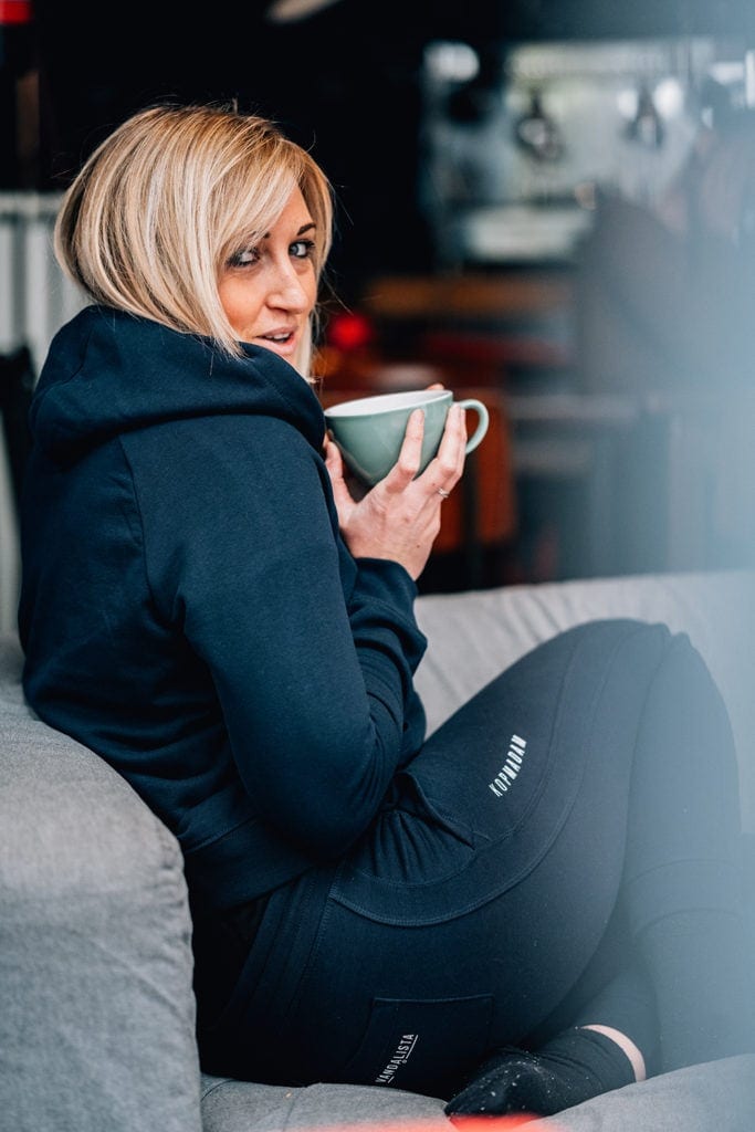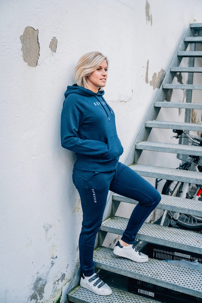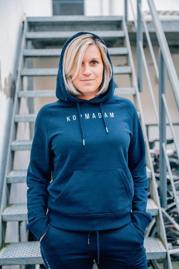 Kopmadam, pour toutes les femmes, les dames et les chickas du groupe de femmes qui ne cesse de s'agrandir. Nous avons développé cette nouvelle collection féminine en collaboration avec Elke Bleyaert. Elke est la femme qui se cache derrière le cycliste de haut niveau Jasper Stuyven, mais elle a aussi beaucoup de plumes dans son chapeau. Elle est notamment la fondatrice des Femmes Flahutes, un peloton féminin composé de coureuses venues des quatre coins du pays. Elle est également la fondatrice de The Women Peloton, qui a démarré en avril avec un podcast, mais qui est déjà devenu une plateforme en ligne avec du contenu (basé sur les femmes) pour les femmes à vélo. Elke veillera à ce que l'accent soit mis davantage sur les imprimés féminins, mais elle accordera également une attention particulière aux coupes et aux tailles de nos vêtements pour femmes. Ce pantalon de jogging de taille moyenne avec un imprimé subtil sur la jambe droite, de couleur marine et dans un tissu ultra-doux, est l'une de ses contributions !