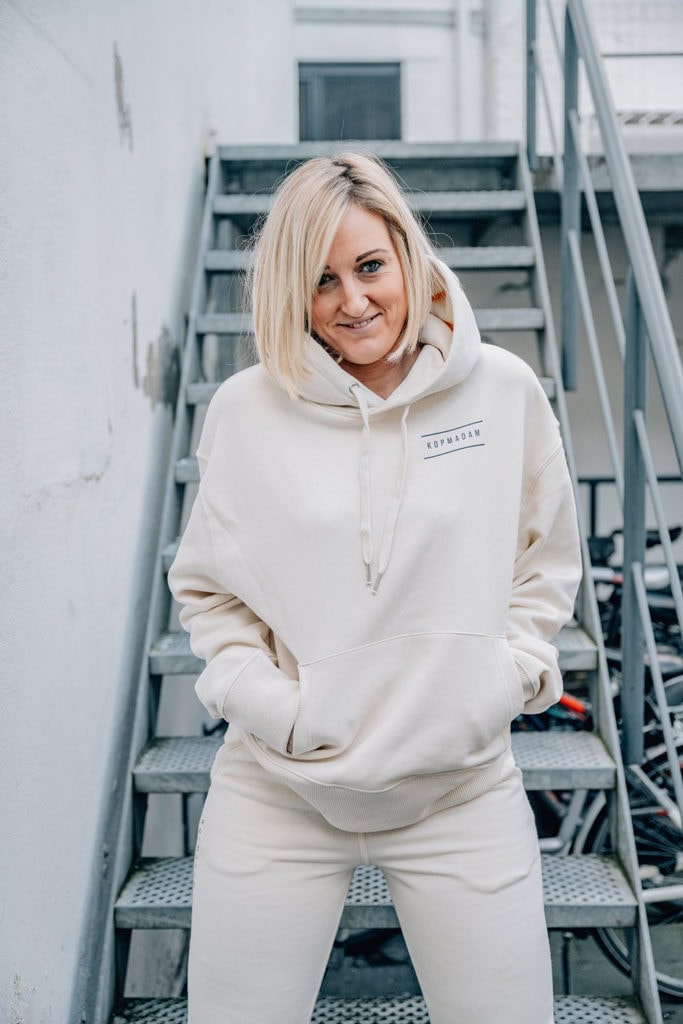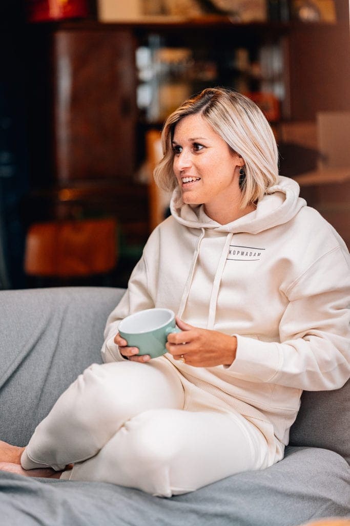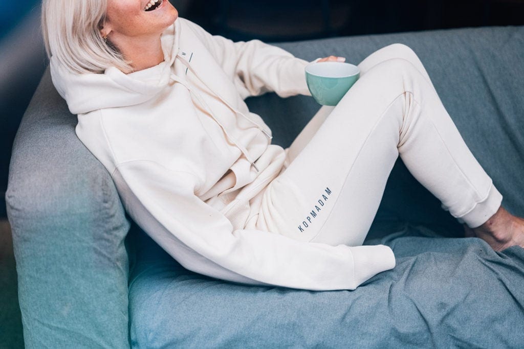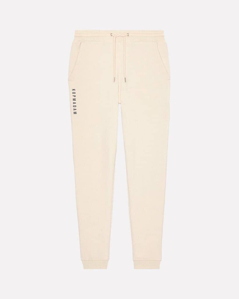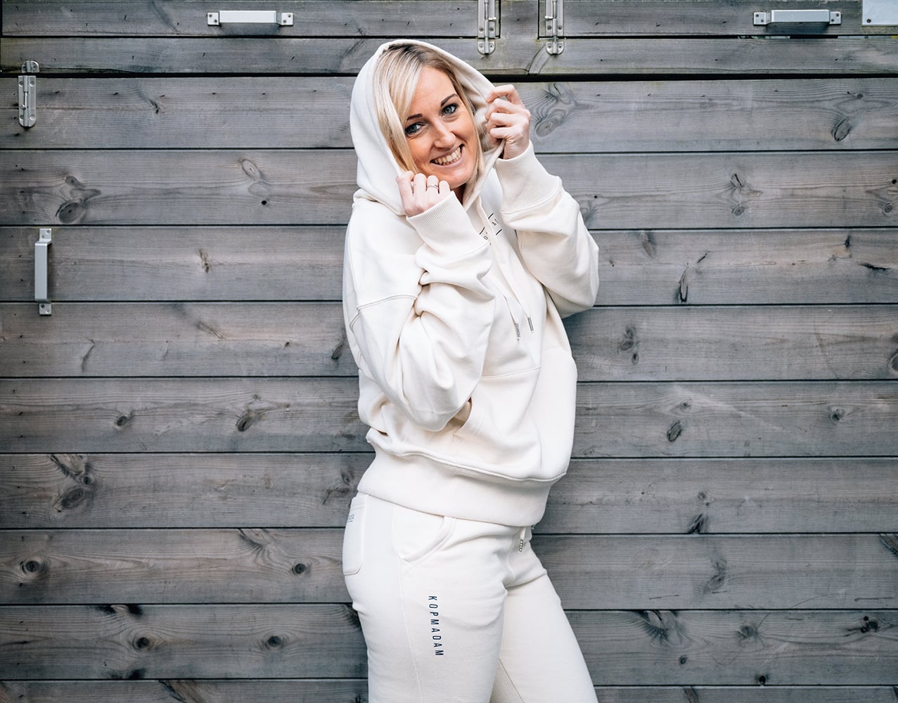 Kopmadam, pour toutes les femmes, les dames et les chickas du groupe de femmes qui ne cesse de s'agrandir. Nous avons développé cette nouvelle collection féminine en collaboration avec Elke Bleyaert. Elke est la femme qui se cache derrière le cycliste de haut niveau Jasper Stuyven, mais elle a aussi beaucoup de plumes dans son chapeau. Elle est notamment la fondatrice des Femmes Flahutes, un peloton féminin composé de coureuses venues des quatre coins du pays. Elle est également la fondatrice de The Women Peloton, qui a démarré en avril avec un podcast, mais qui est déjà devenu une plateforme en ligne avec du contenu (basé sur les femmes) pour les femmes à vélo. Elke veillera à ce que l'accent soit mis davantage sur les imprimés féminins, mais elle accordera également une attention particulière aux coupes et aux coupes de nos vêtements pour femmes. Ce pantalon de jogging à la coupe décontractée, avec un imprimé subtil sur la jambe droite, dans un coloris blanc vintage et un tissu ultra-doux, est l'une de ses contributions ! Choisissez de préférence une taille en dessous de votre taille habituelle.