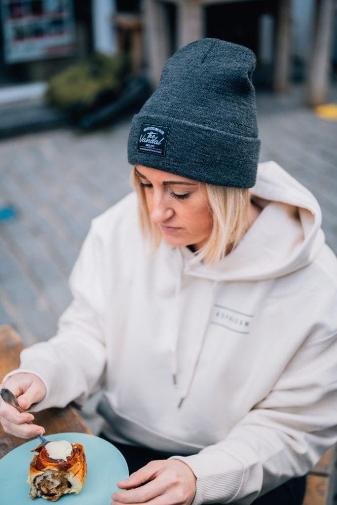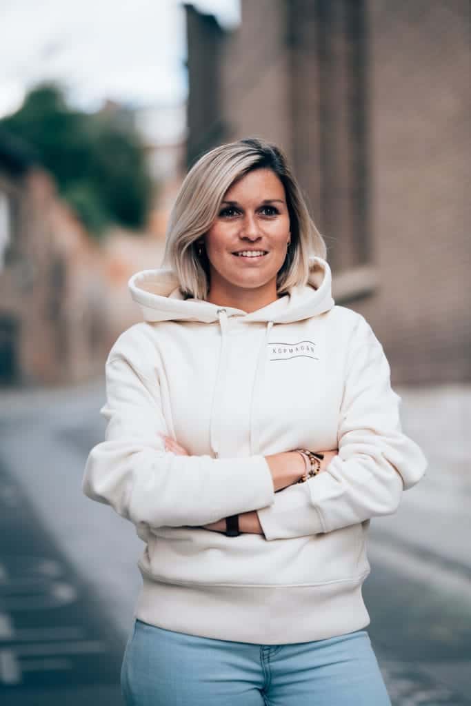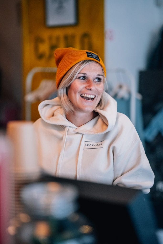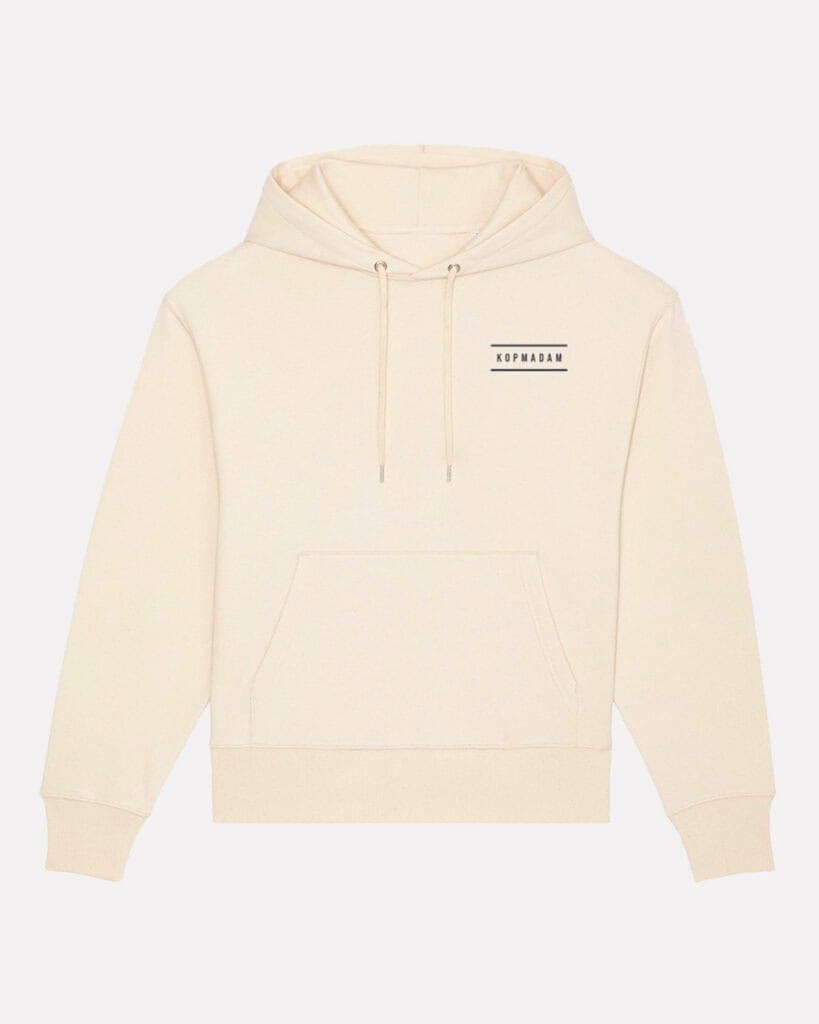 Kopmadam, pour toutes les femmes, les dames et les chickas du groupe de femmes qui ne cesse de s'agrandir. Nous avons développé cette nouvelle collection féminine en collaboration avec Elke Bleyaert. Elke est la femme qui se cache derrière le cycliste de haut niveau Jasper Stuyven, mais elle a aussi beaucoup de plumes dans son chapeau. Elle est notamment la fondatrice des Femmes Flahutes, un peloton féminin composé de coureuses venues des quatre coins du pays. Elle est également la fondatrice de The Women Peloton, qui a démarré en avril avec un podcast, mais qui est déjà devenu une plateforme en ligne avec du contenu (basé sur les femmes) pour les femmes à vélo. Elke veillera à ce que l'on accorde encore plus d'attention aux imprimés des vraies femmes, mais aussi aux coupes et aux tailles de nos vêtements féminins. Ce sweat à capuche large en blanc vintage avec un petit imprimé sur la poitrine est l'un d'entre eux. Veuillez noter que ce pull est assez large, alors n'hésitez pas à prendre une taille de moins que d'habitude 😉