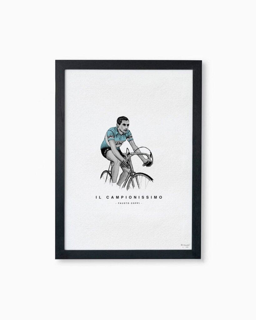 De kampioen der kampioenen “Il Campionissimo”, een naam weggelegd enkel voor de grootste der aarde. Fausto heeft in zijn carrière 5x de Giro, 2x de tour, 5x Lombardije, 3x Milaan San Remo en 1x Parijs Roubaux gewonnen en was daarnaast ook wereldkampioen in ’53 en werelduurrecordhouder vanaf 1942. De flamboyante Italiaan stond ook bekend om zijn strijd tegen die andere grootheid Bartali maar ook door zijn turbulent liefdesleven. Met andere woorden een wielerlegende die alles in huis had om meer dan 60 jaar na zijn tragische dood nog steeds te boek te staan als één van de grootste. Reden genoeg dus om hem bij de posters toe te voegen.