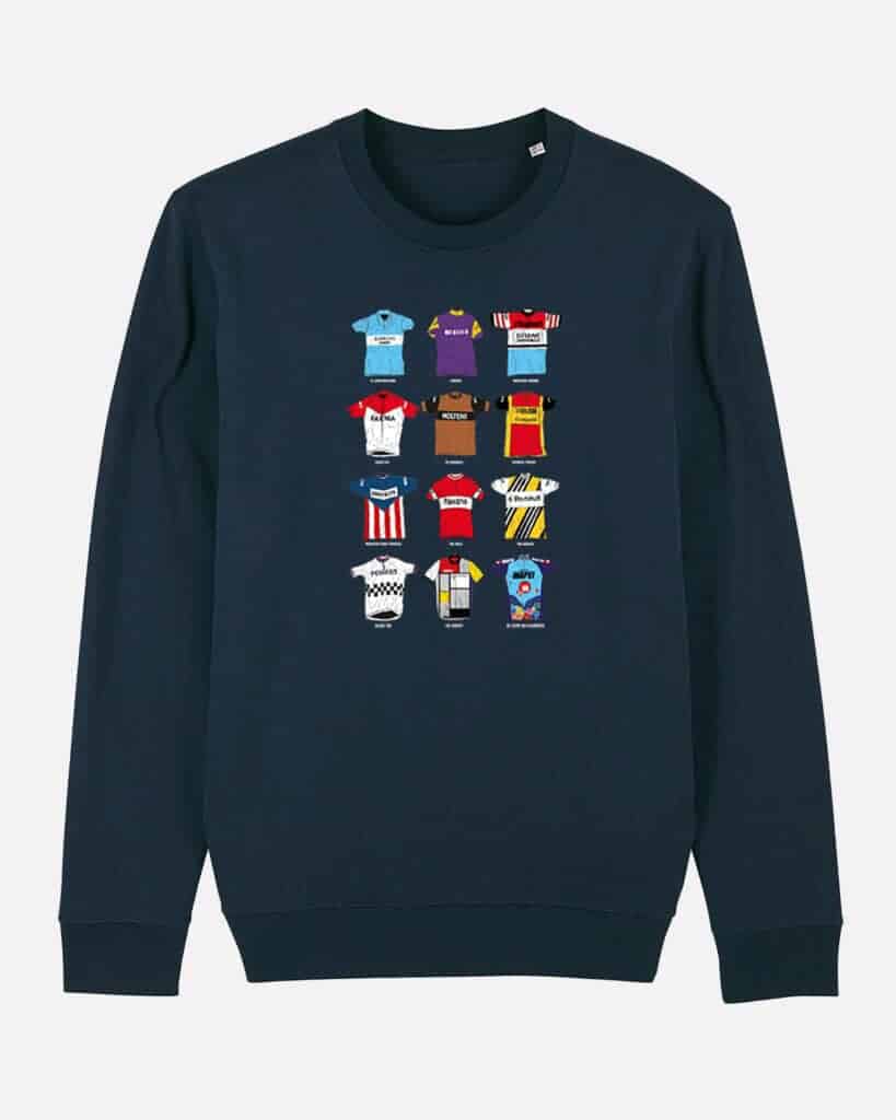 The Jersey, dat is onze top 12 van de mooiste koerstruien. Al sinds het begin van de wielersport rijden coureurs rond in opvallende truien met daarop namen van vaak illustere  sponsors. Geef toe, er zijn ontzettend veel lelijke koerstruien gemaakt: foute kleurencombinaties en misselijkmakende patronen met daarop een overvloed aan schreeuwerige sponsornamen. Maar er zaten ook prachtstukken bij, die gedragen werden door de grootste kampioenen. Omdat we zelf grote fan zijn van deze klassiekers staken we onze eigen klassieker speciaal voor jullie in een nieuw jasje. Deze warme en comfortabele sweater doet je pronken met je passie voor de koers.