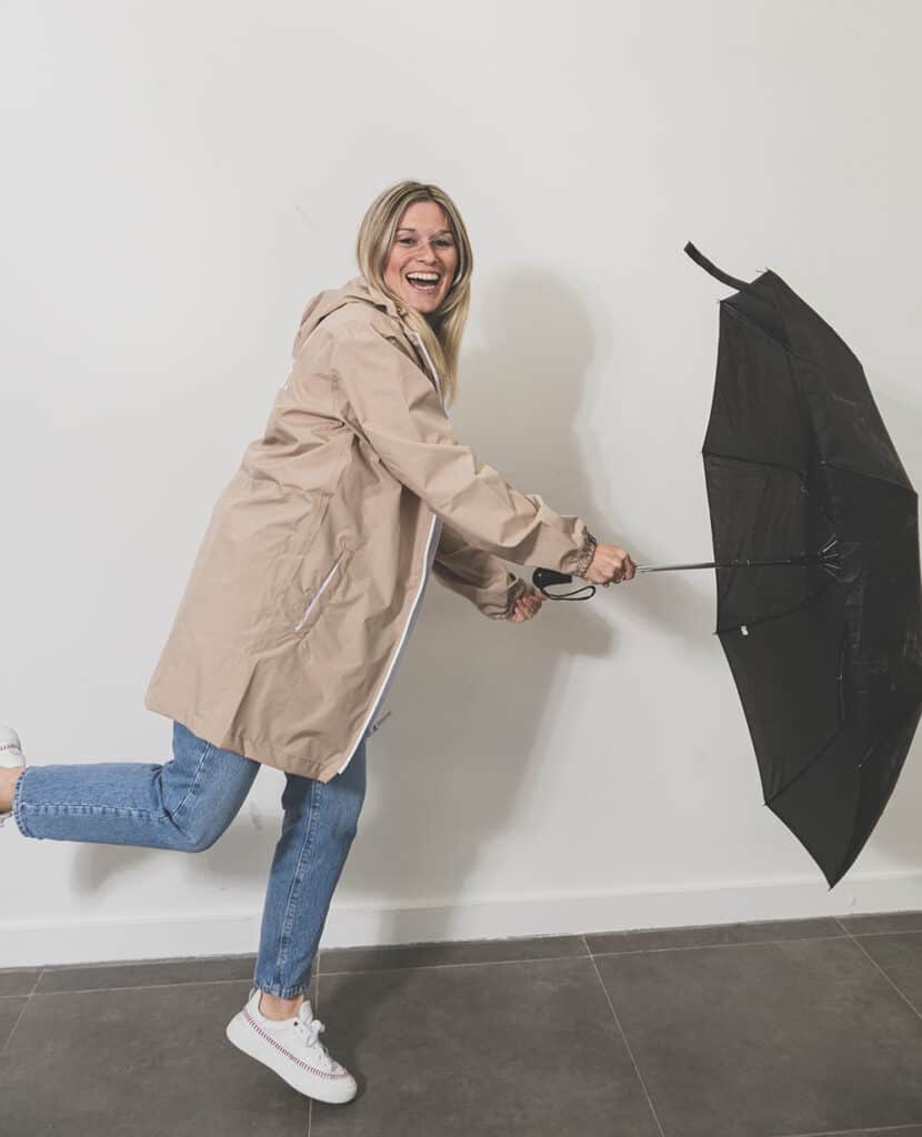 • Ons model Elke is 1m58 groot en draagt maat XS van deze regenjas.