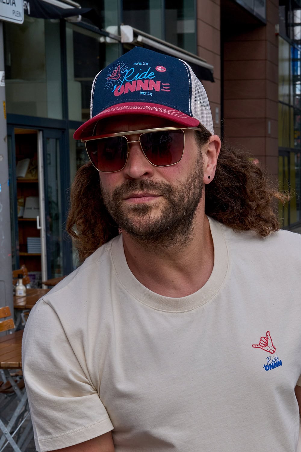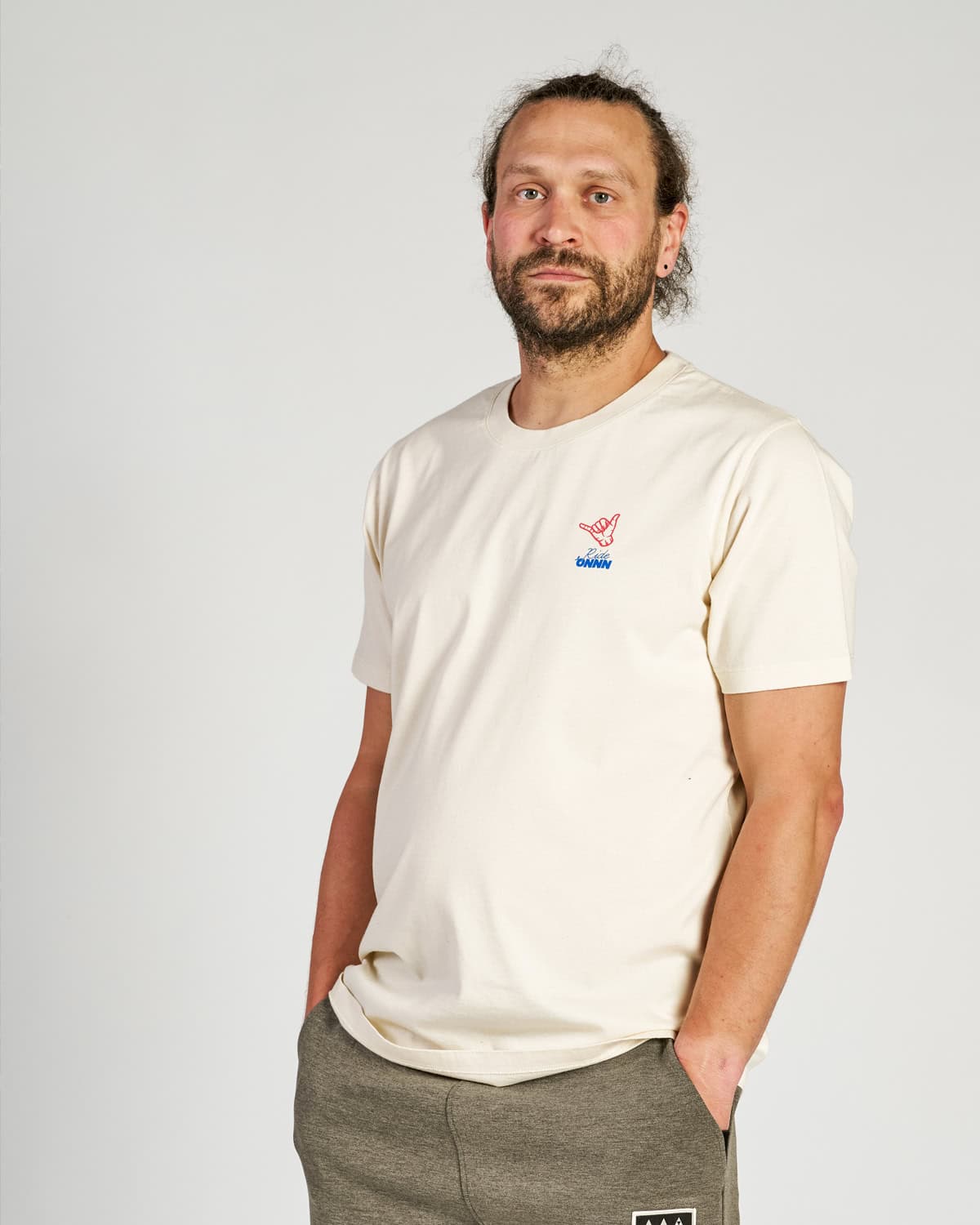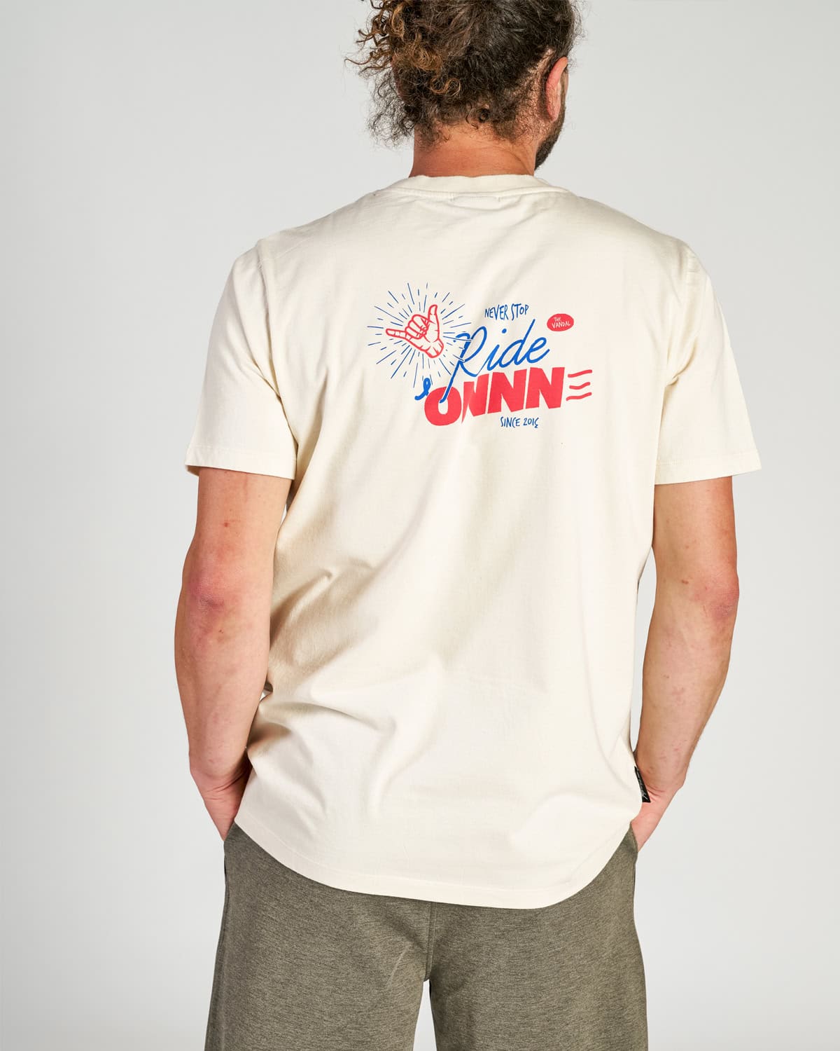 Onze Ride Onn T-shirt. Oorspronkelijk uit de surfwereld, nu onmisbaar in de fietscultuur: Ride Onn. Een simpel gebaar, een gedeelde passie. Want niets verbindt fietsers meer dan een begroeting onderweg – een teken van respect, vrijheid en avontuur.